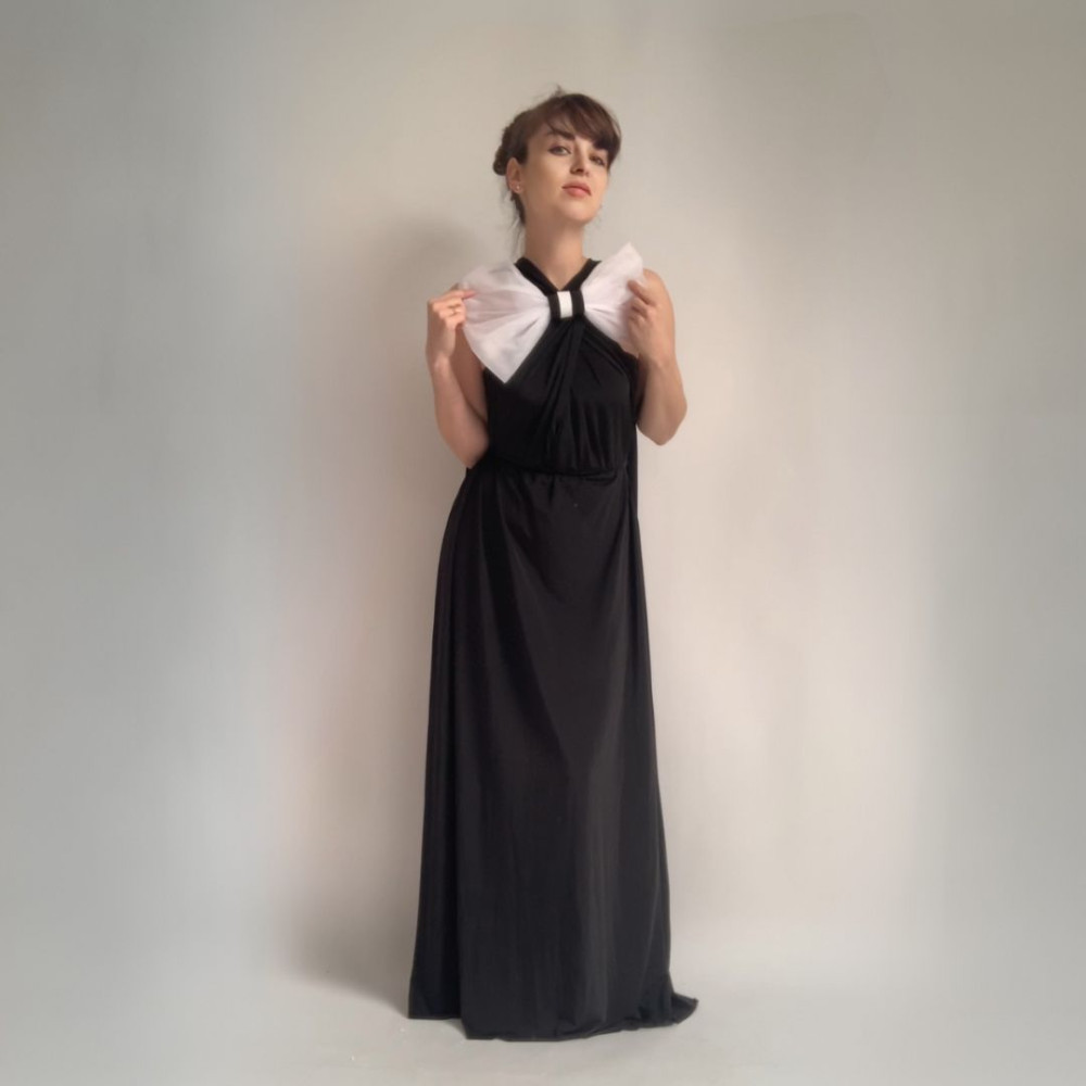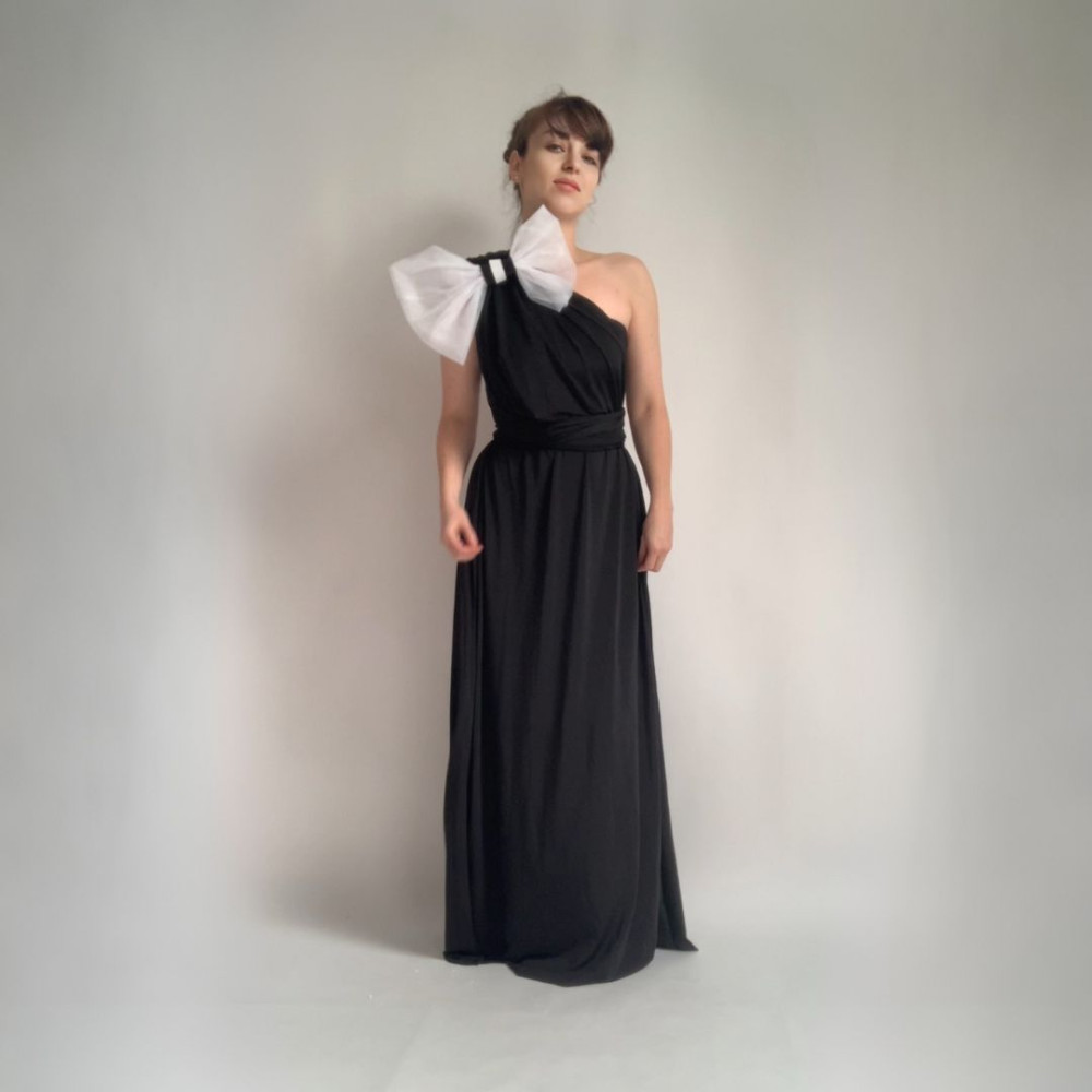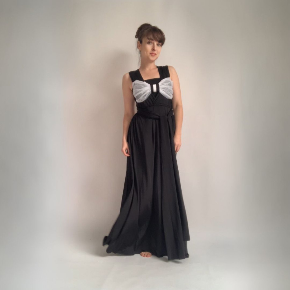 Tento produkt obsahuje antracitové šaty z materiálu NILPET a tylovou MAŠLI, kterou si můžete spolu se šaty různě uvázat.