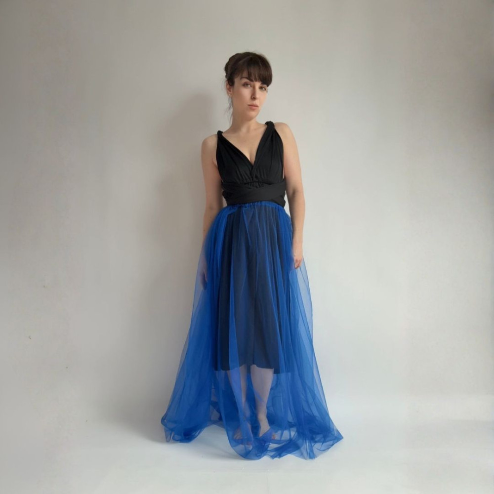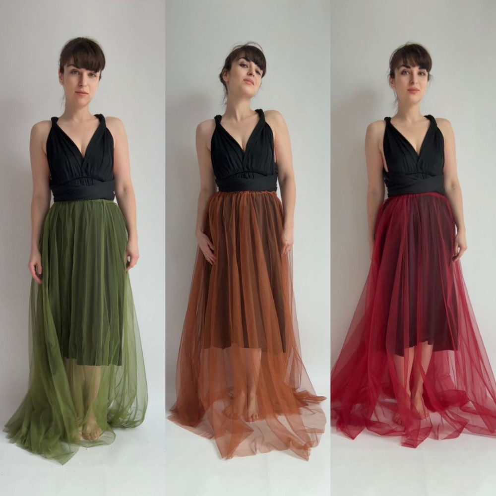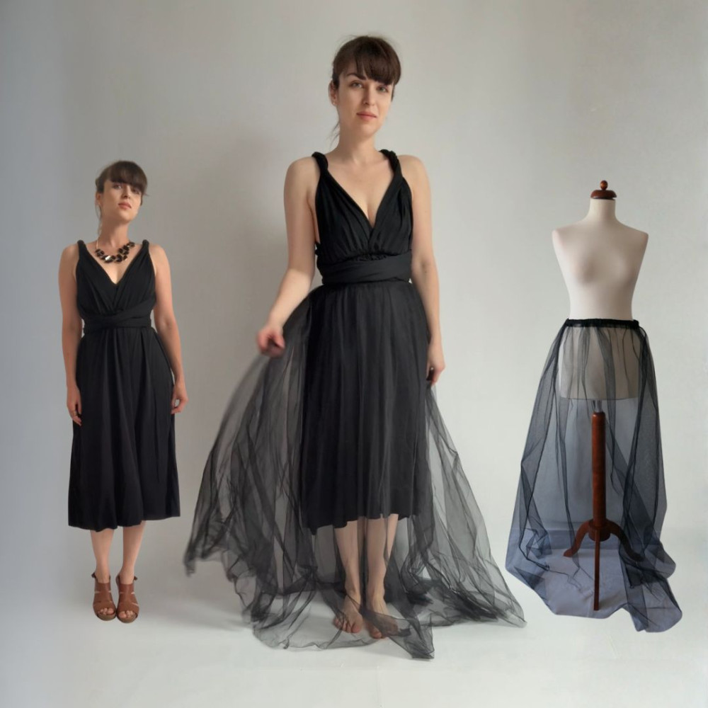 Tento komplet zahrnuje MIDI variabilní šaty (v délce 80 cm od gumičky v pase) a DLOUHOU tylovou sukni (v délce 115 cm od gumičky v pase). Oba produkty se dají nosit samostatně.