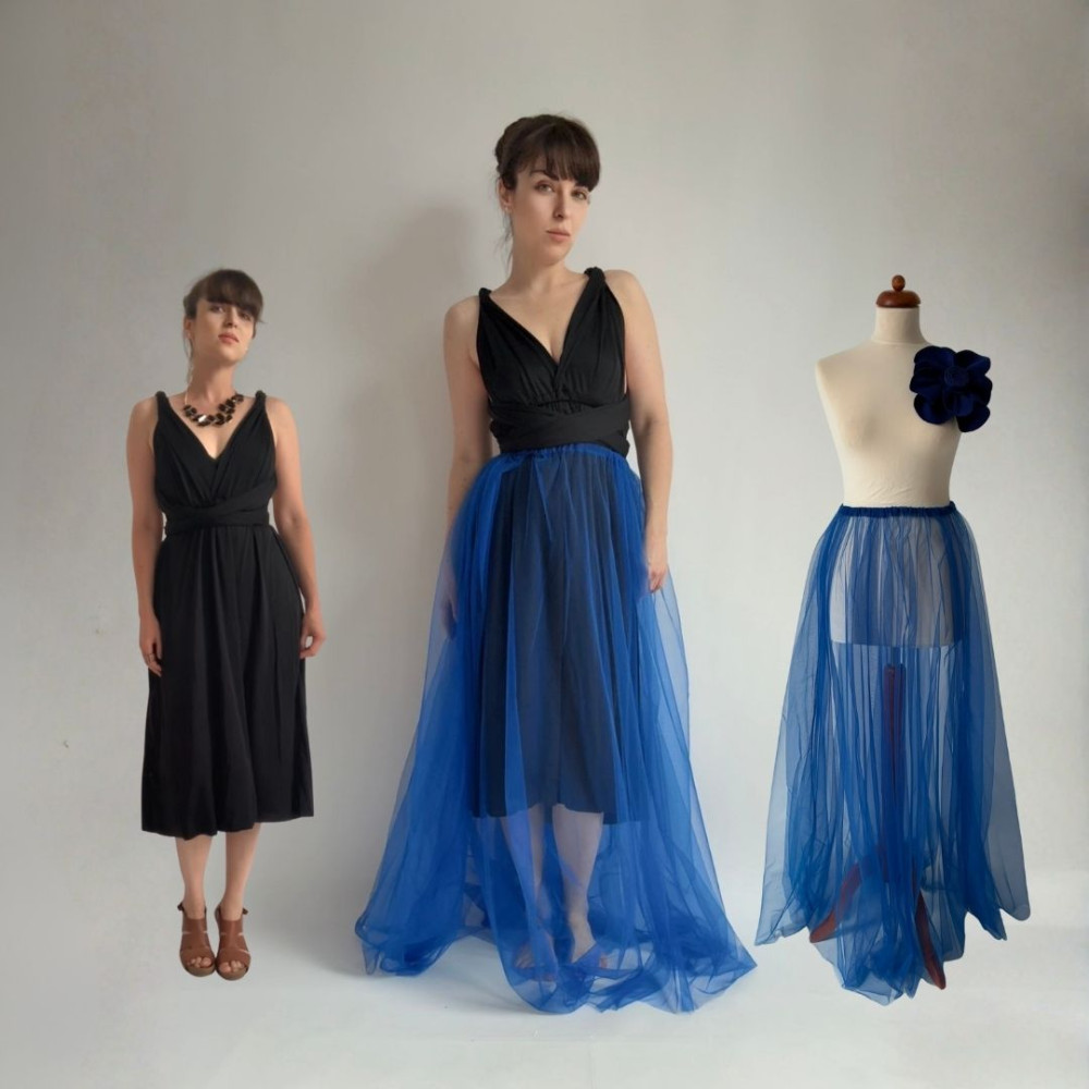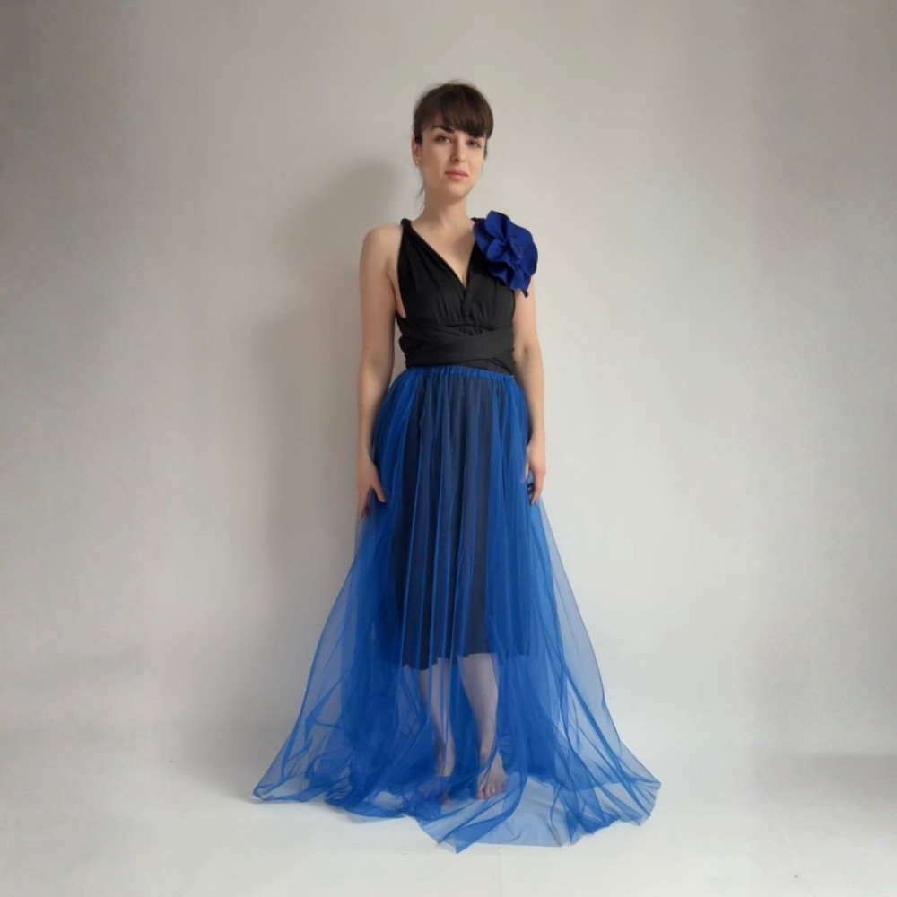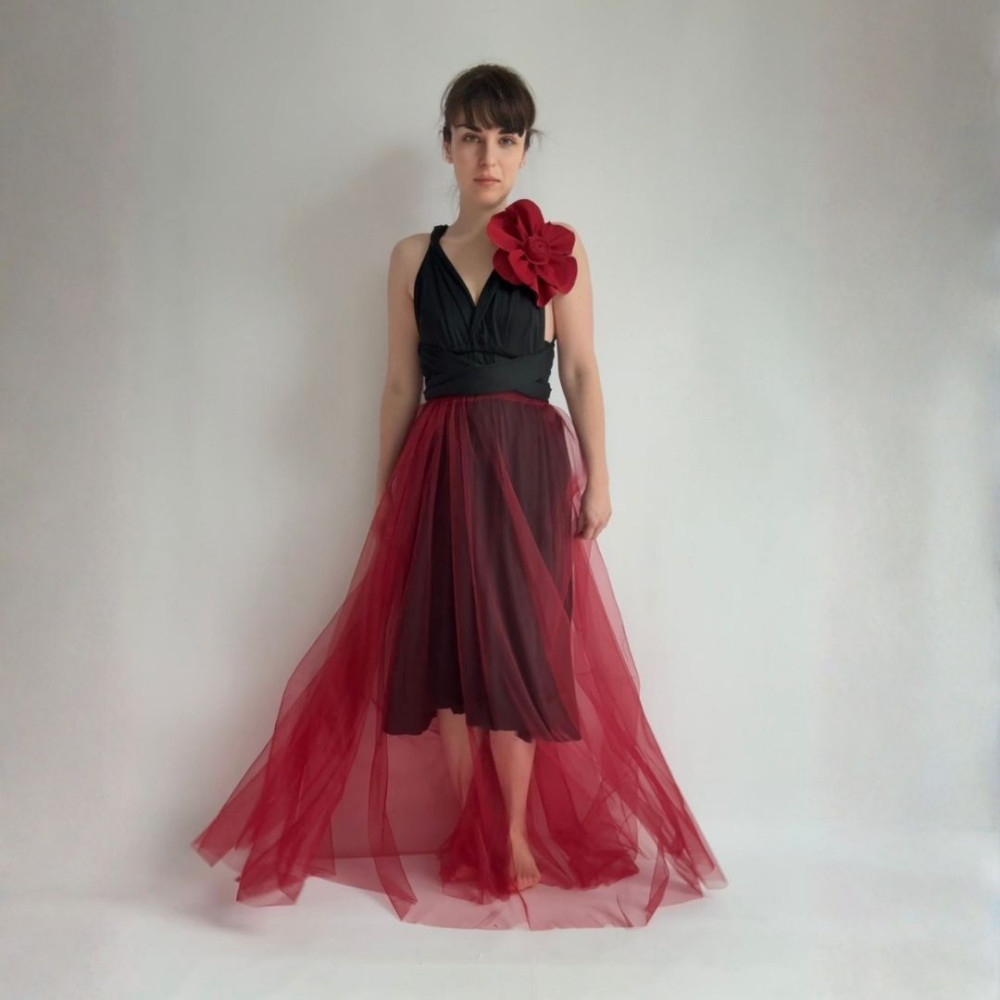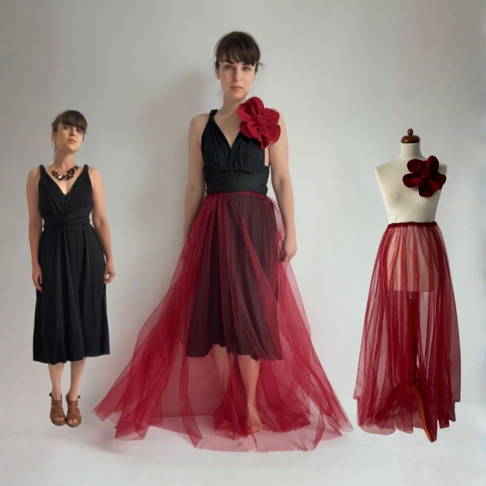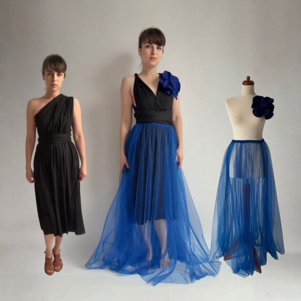Tento komplet zahrnuje originální květinu, MIDI variabilní šaty (v délce 80 cm od gumičky v pase) a DLOUHOU tylovou sukni (v délce 115 cm od gumičky v pase). Všechny produkty se dají nosit samostatně.