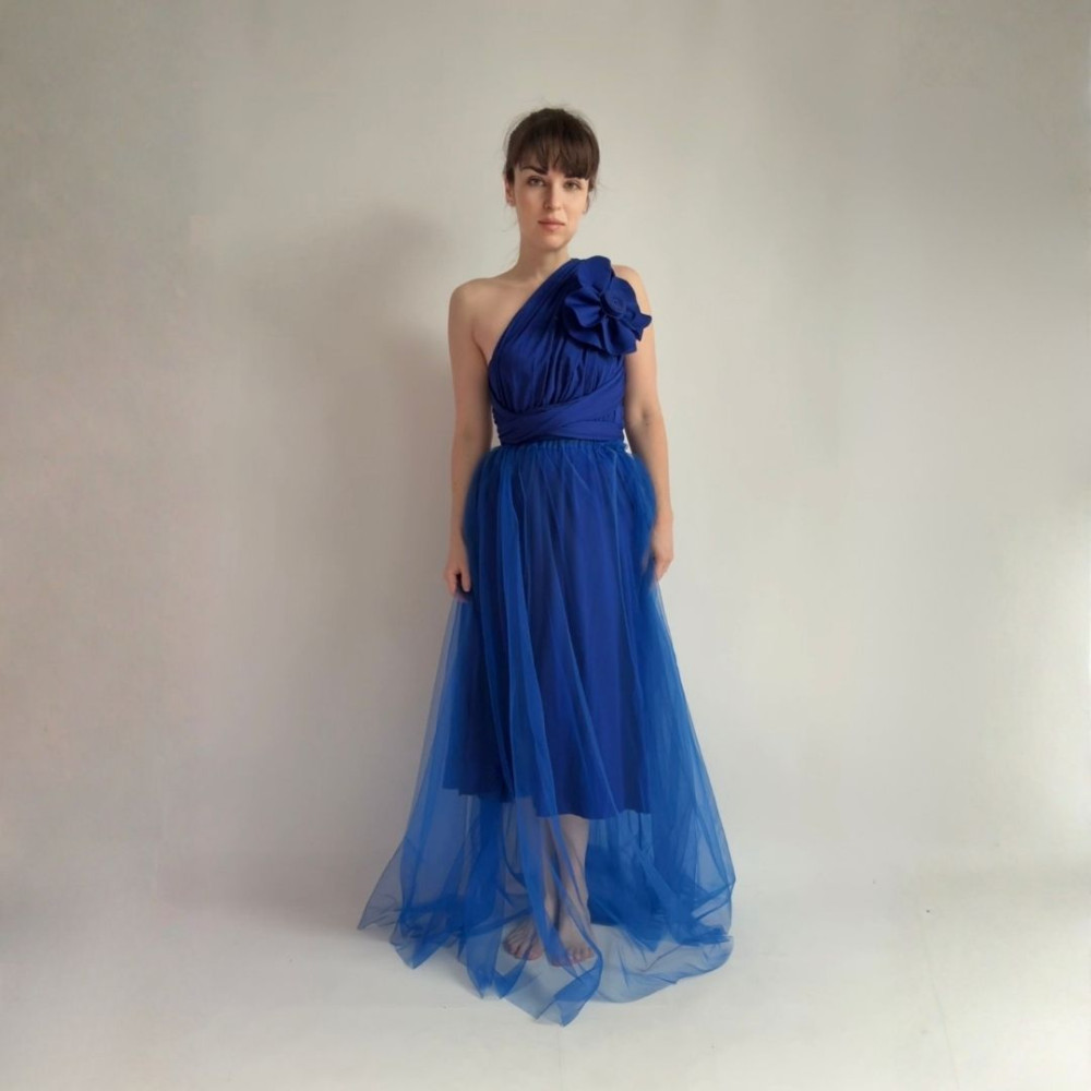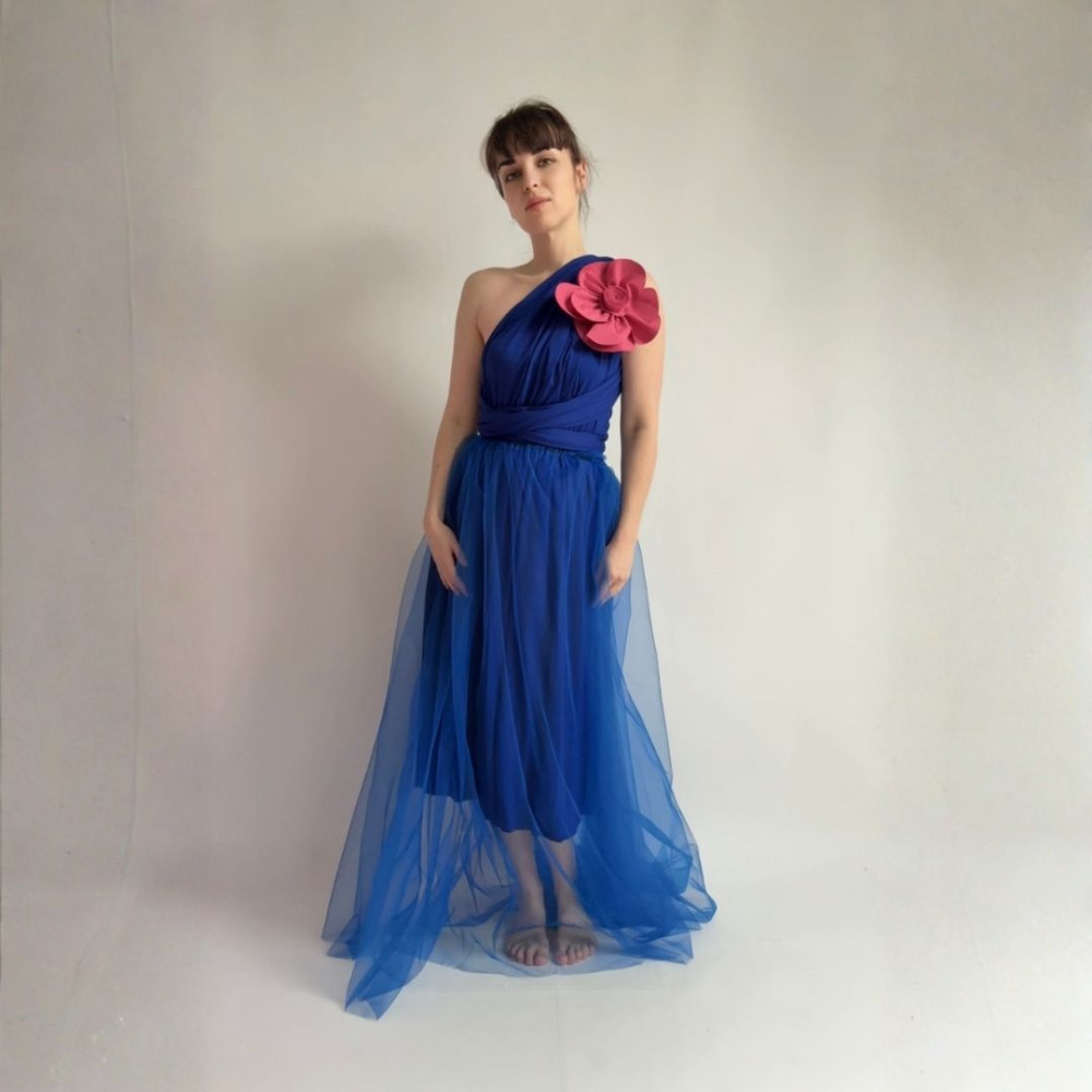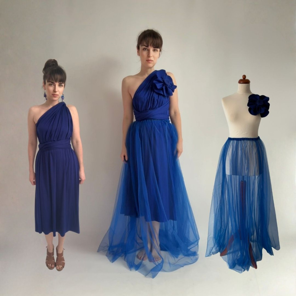 Tento komplet zahrnuje originální květinu, MIDI variabilní šaty (v délce 80 cm od gumičky v pase) a DLOUHOU tylovou sukni (v délce 115 cm od gumičky v pase). Všechny produkty se dají nosit samostatně.