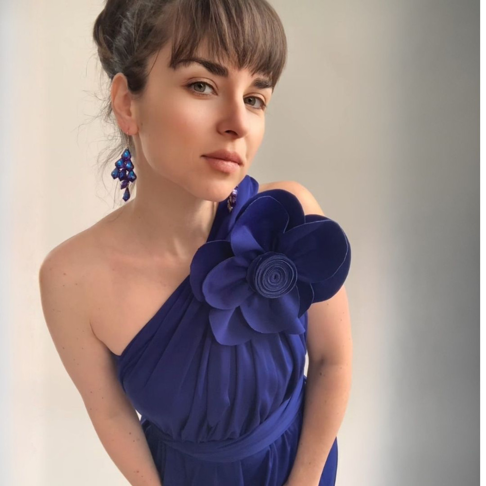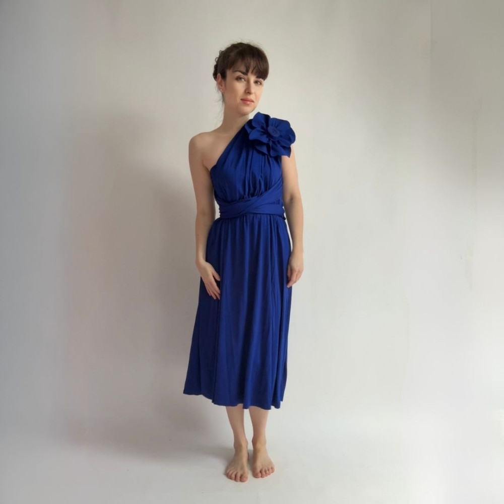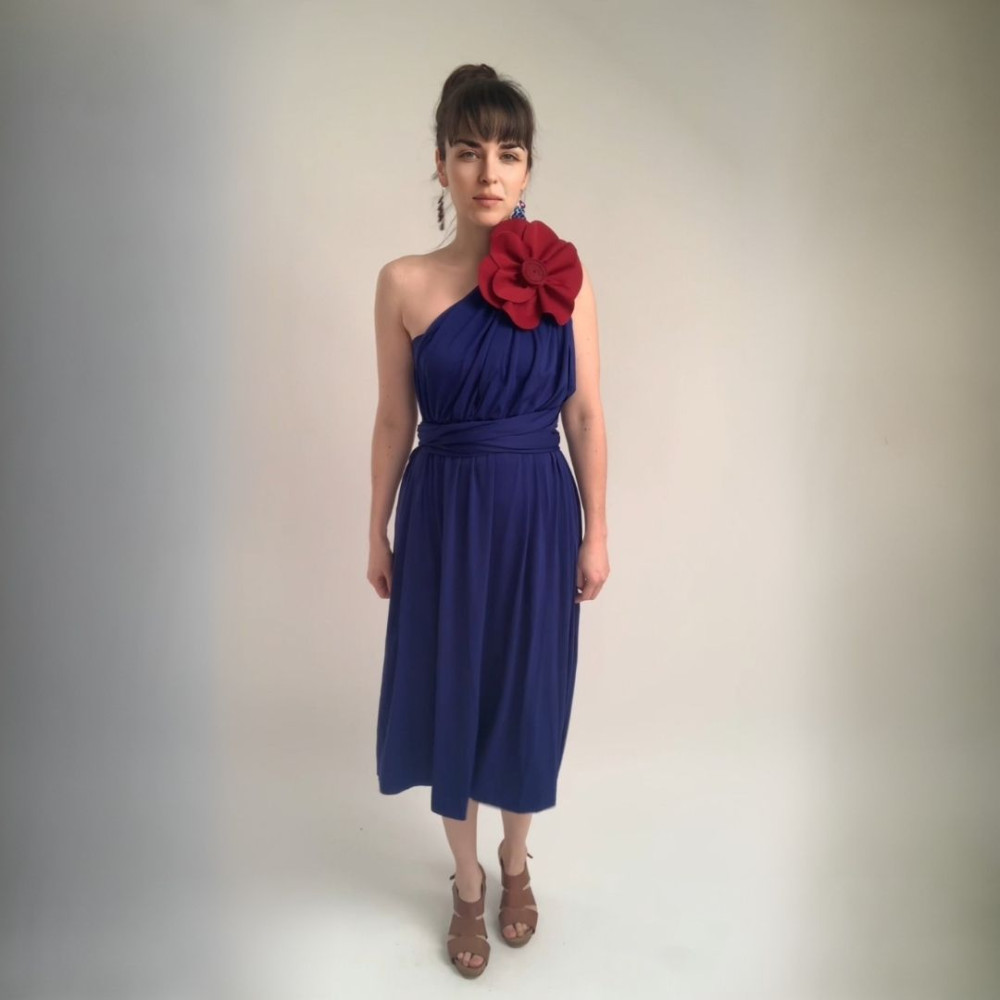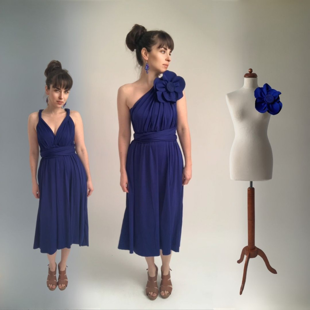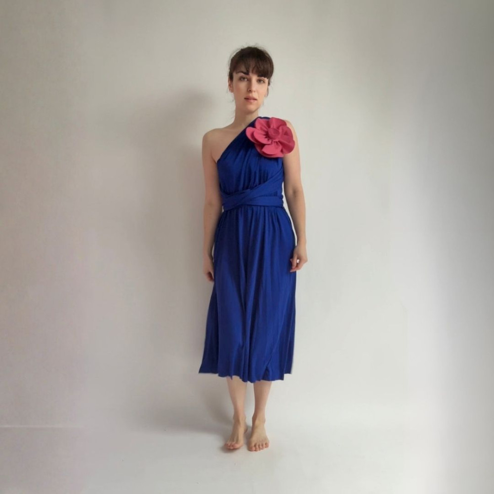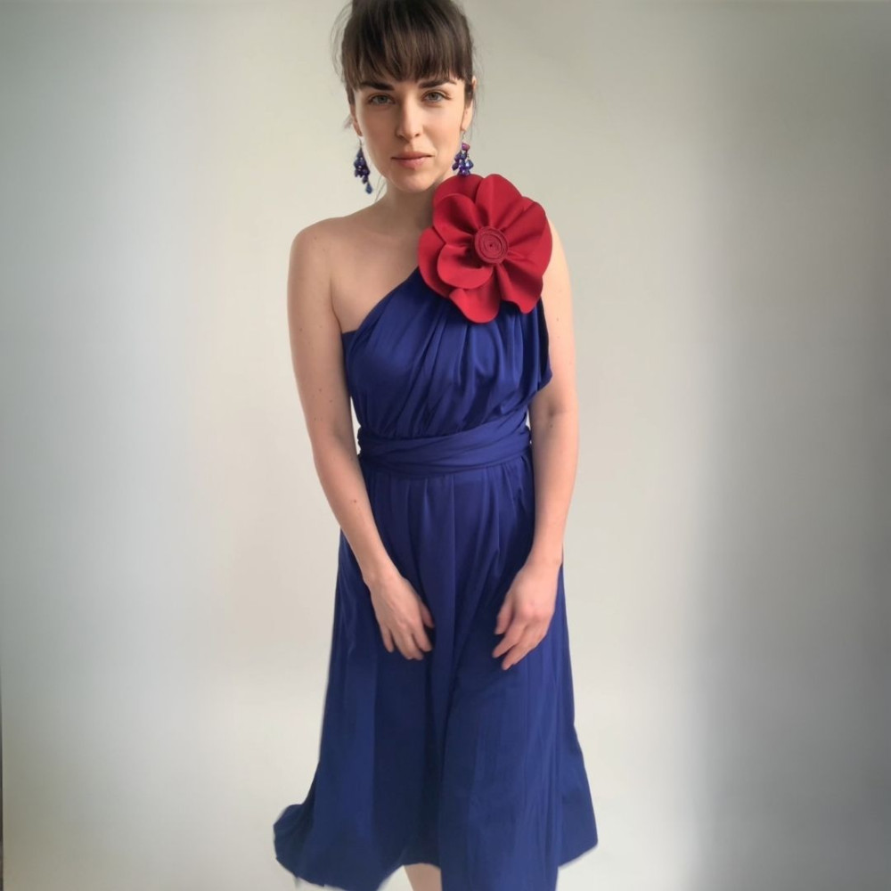 Tento komplet zahrnuje MIDI variabilní šaty (v délce 80 cm od gumičky v pase) a originální květinu, která se může uvázat kamkoliv na šaty, dát na ruku nebo připnout na hlavu jako fascinátor.