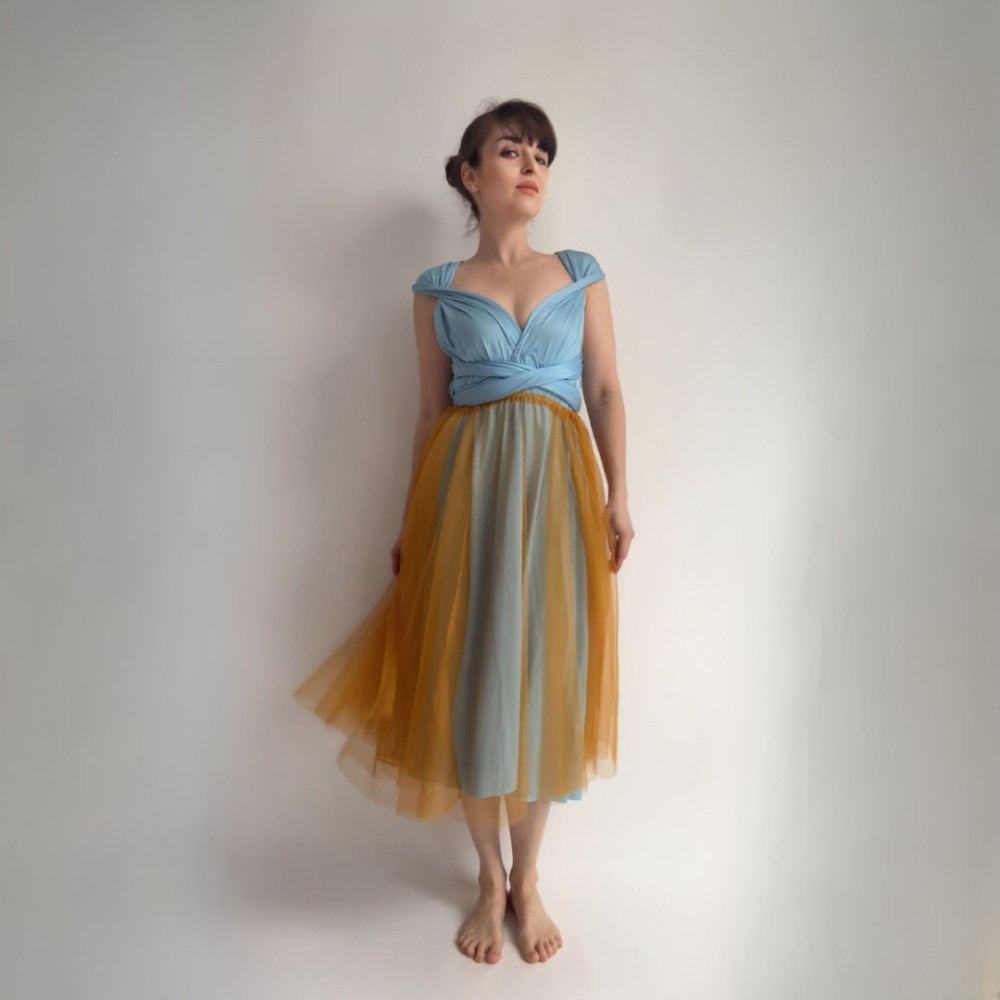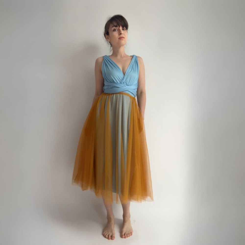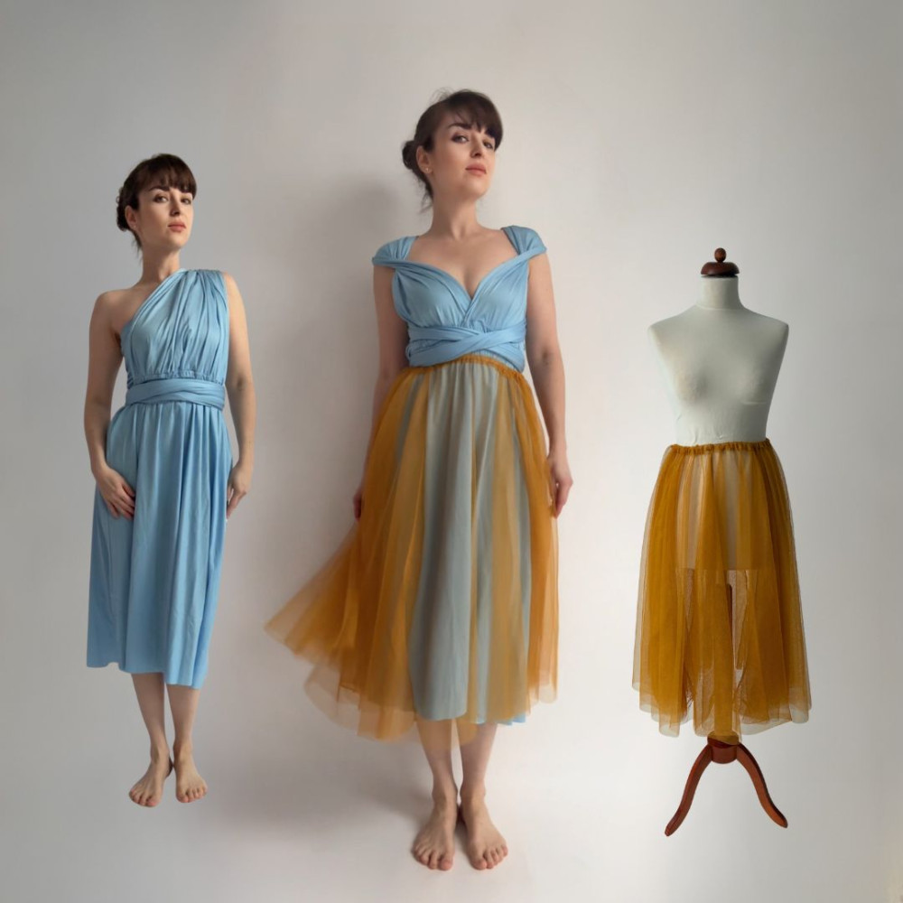 Komplet MIDI variabilních dlouhých šatů (v délce 80 cm od gumičky v pase na zem) z kolekce Bohème v provedení Convertibles® NILPLA® a MIDI okrové tylové sukně Convertibles®.