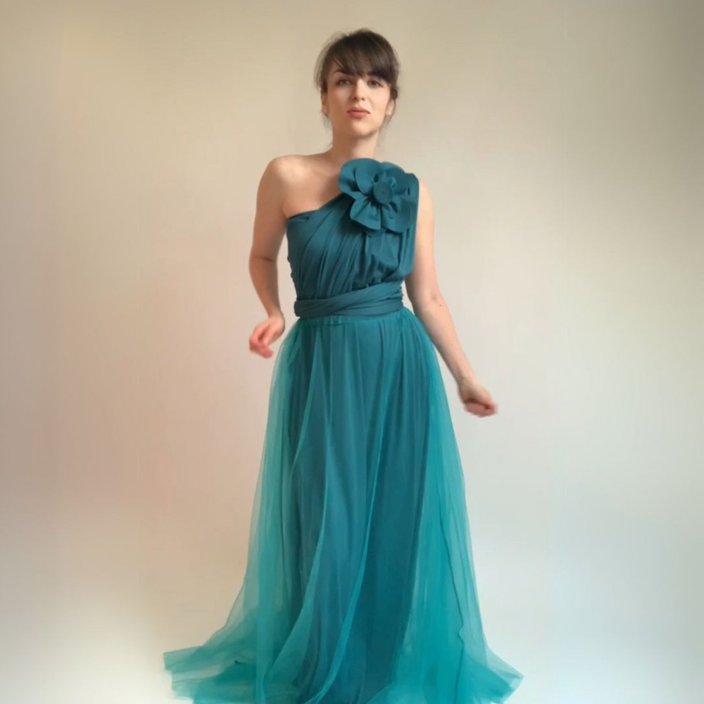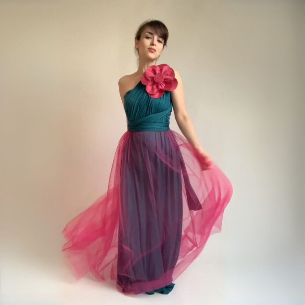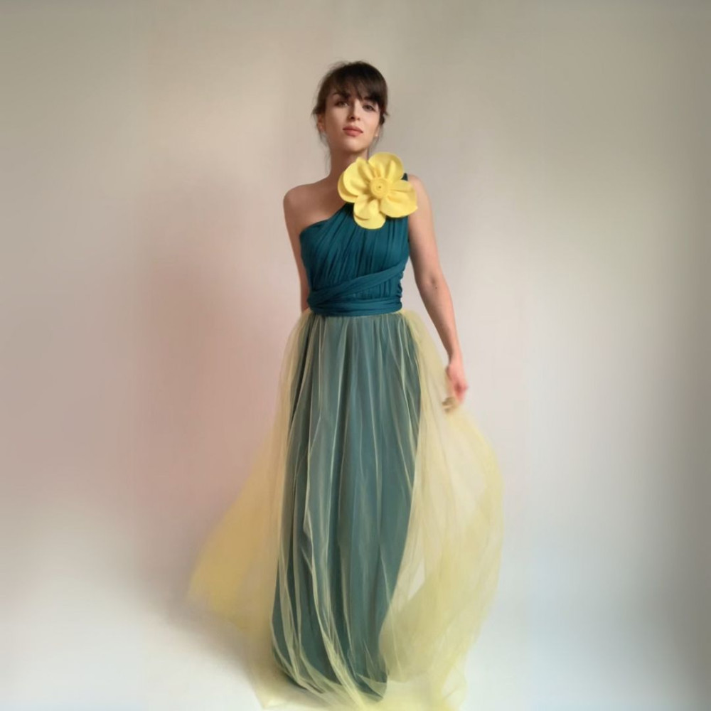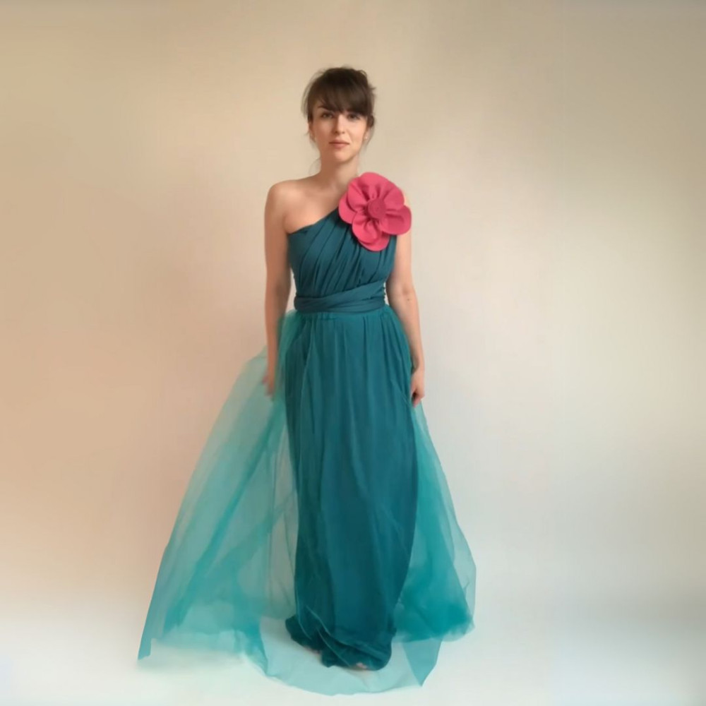 Zvýhodněná sada variabilních dlouhých šatů z kolekce Bohème a tylové sukně a květiny ve stejné barvě šatů v provedení Convertibles® cirkulární materiál NILPET®.