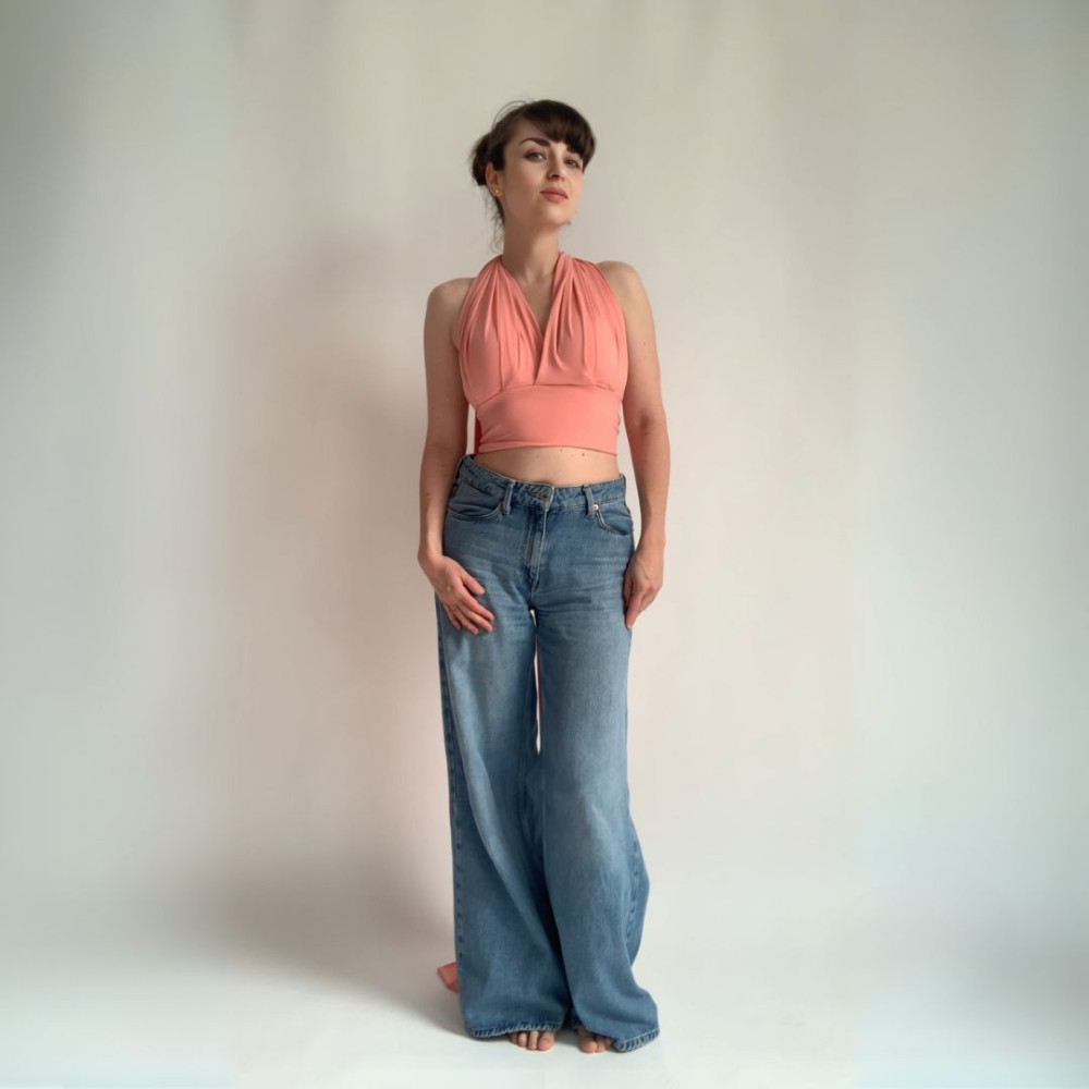 Variabilní crop top Bohème - halenka, která se nosí ke kalhotám nebo sukni s vysokým pasem. Dá se vázat na mnoho způsobů stejně jako šaty střihu Bohème. Nemá gumičku v pase, pas stahuje specifický střih a látka úpletového materiálu. Tento crop top má dvojitý střih vázacích pruhů a obsahuje odnímatelné vycpávky. Díky tomu není nutné samostatné bolerko a kryje dokonale poprsí i bez něj. Součástí halenky tudíž není bandeau/top přes prsa/ bolerko jako je tomu u šatů.