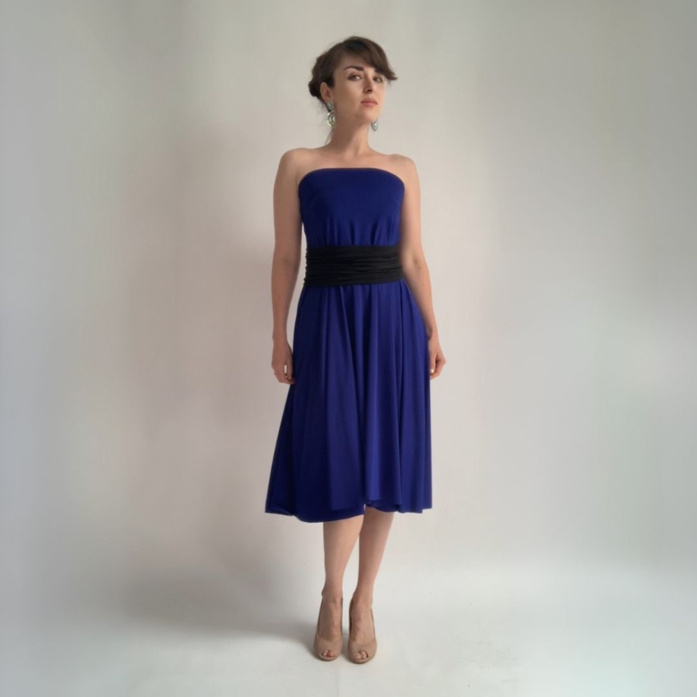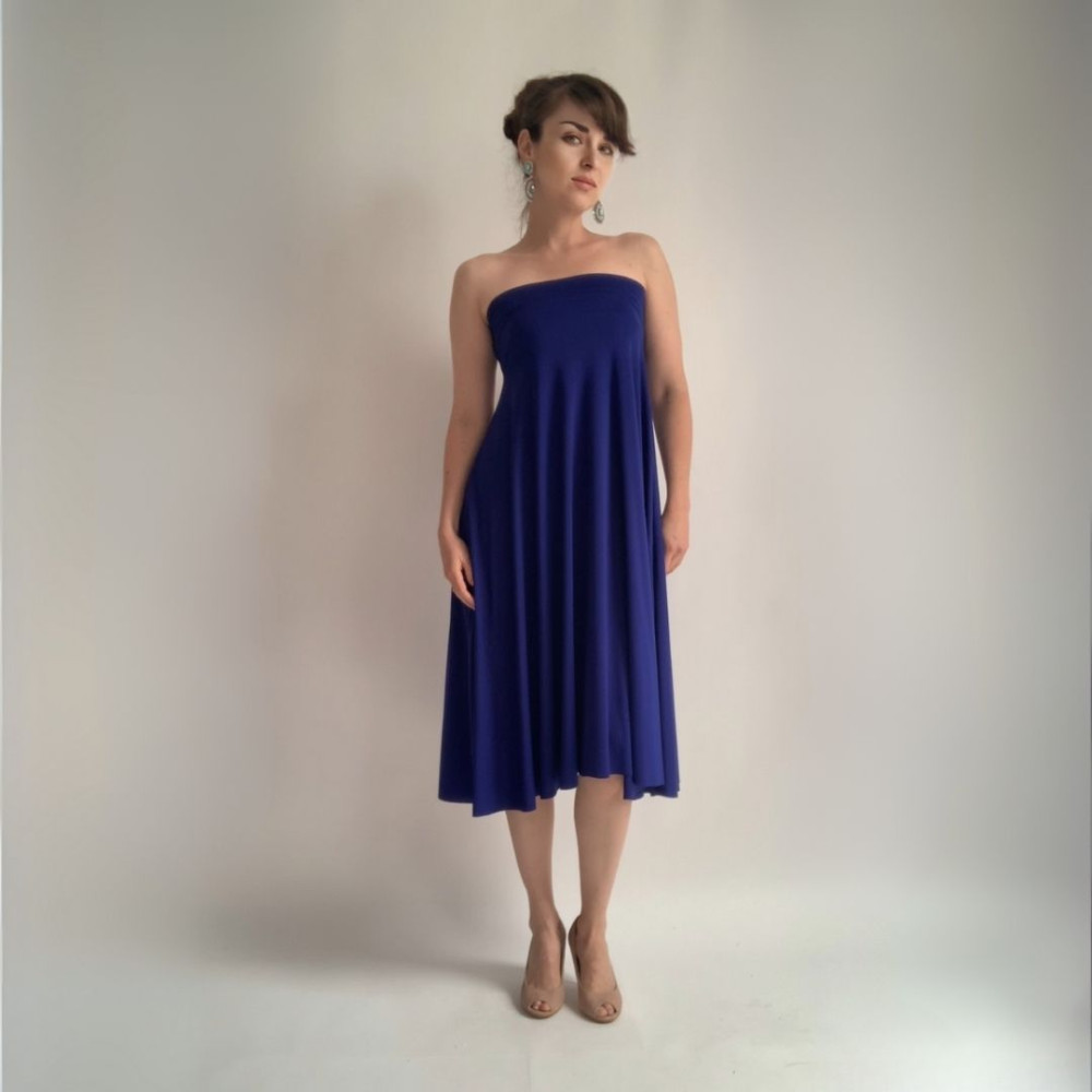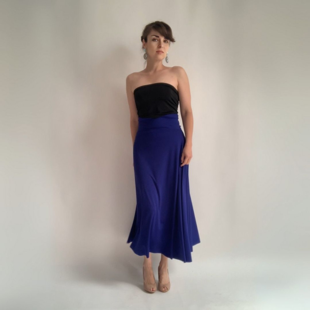 Samostatná sukně v délce midi a áčkového střihu. Bezvadně padne v pase, nikde neškrtí. Nemá žádnou stahovací gumičku, obepíná pas svým střihem a látkou z úpletu. Je lehce rozšířená, krásně se točí, avšak zbytečně nepřidává objem. Délka je midi, což znamená 80cm od spodního lemu v pase, střih pásku je na výšku 12cm. Pruží do obvodu pasu 60 - 120 cm. Dá se nosit v pase jako sukně nebo nad prsy jako šaty.
