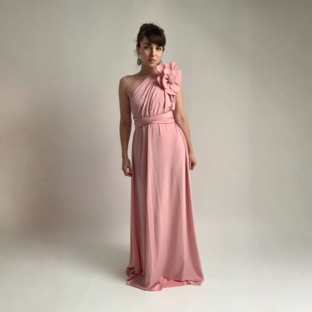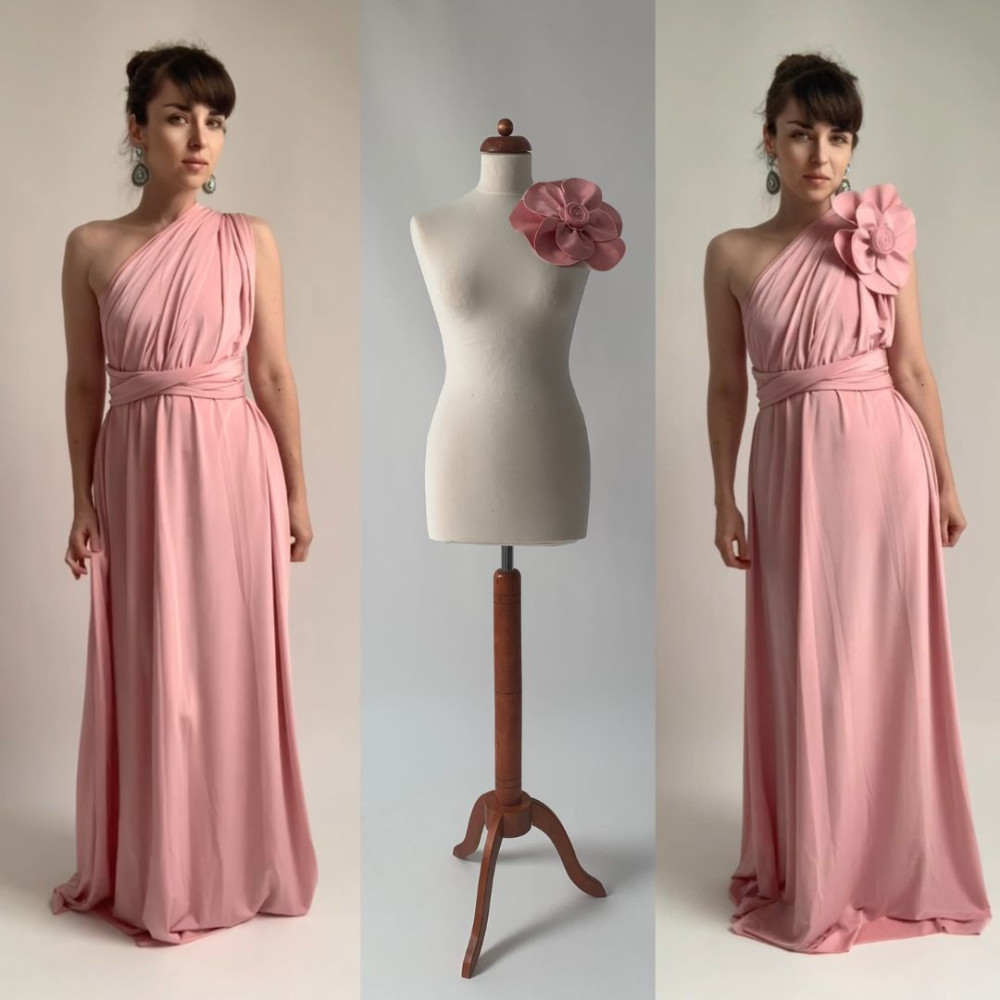 Velká květina je náš originální doplněk k variabilním šatům. Dá se připnout kamkoliv na šaty, na ruku nebo jako fascinátor na hlavu. Je ručně vyrobena ze stejné látky jako šaty. Tato položka obsahuje komplet šatů a květiny ze stejné látky jako šaty (v klasickém materiálu polyester/elastan).