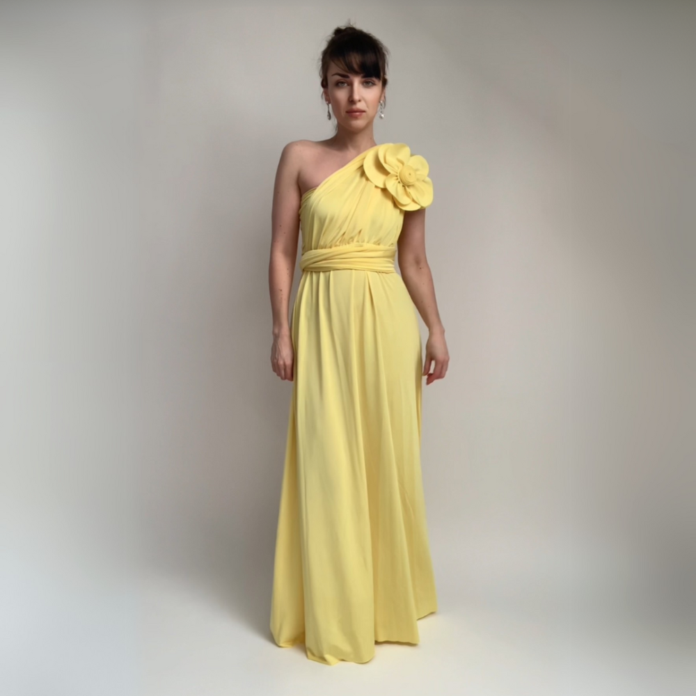 Velká květina je náš originální doplněk k variabilním šatům. Dá se připnout kamkoliv na šaty, na ruku nebo jako fascinátor na hlavu. Je ručně vyrobena ze stejné látky jako šaty. Tato položka obsahuje komplet šatů a květiny ze stejné látky jako šaty (v klasickém materiálu polyester/elastan).