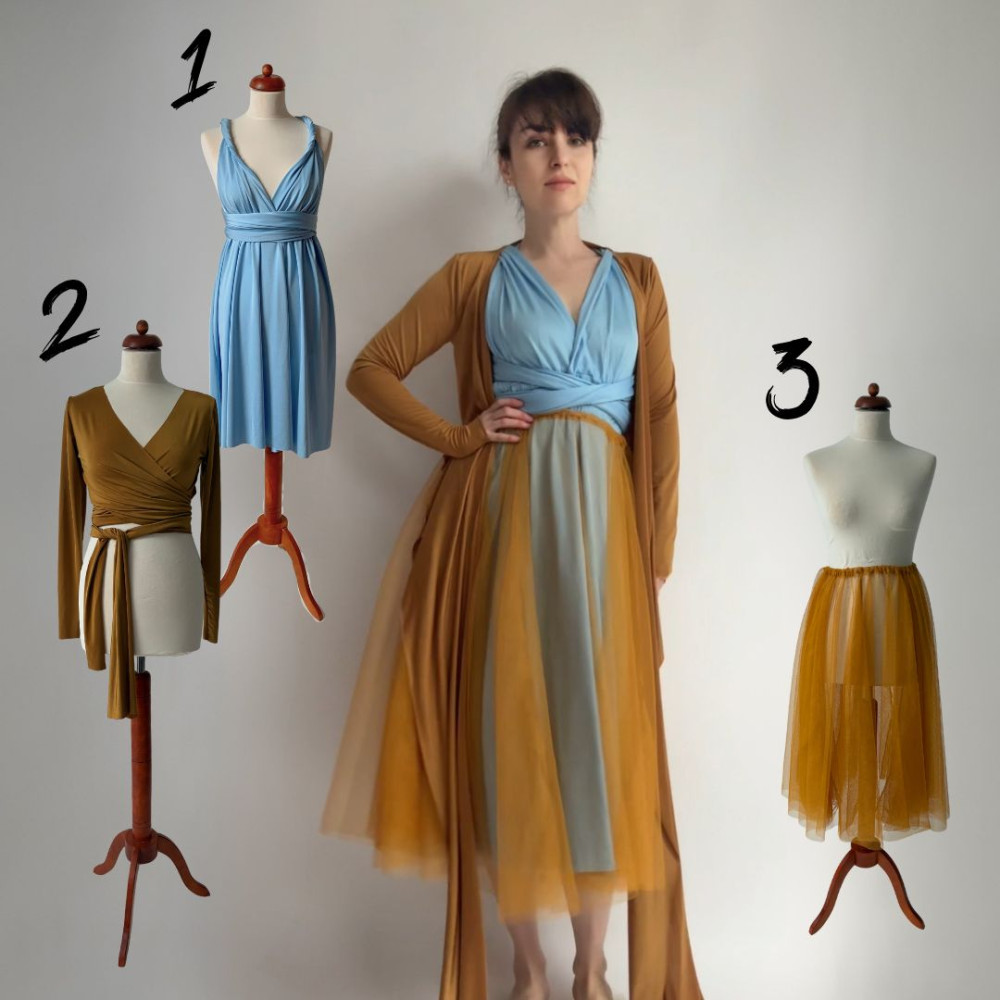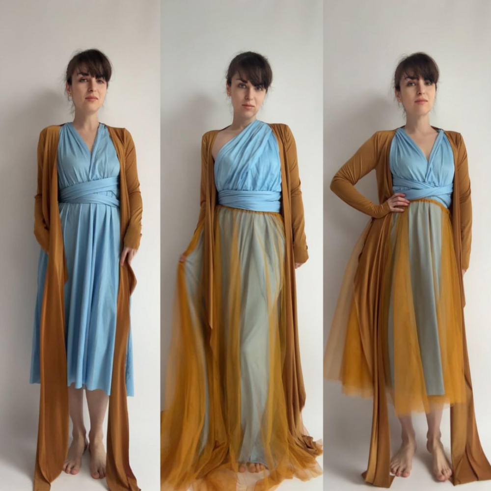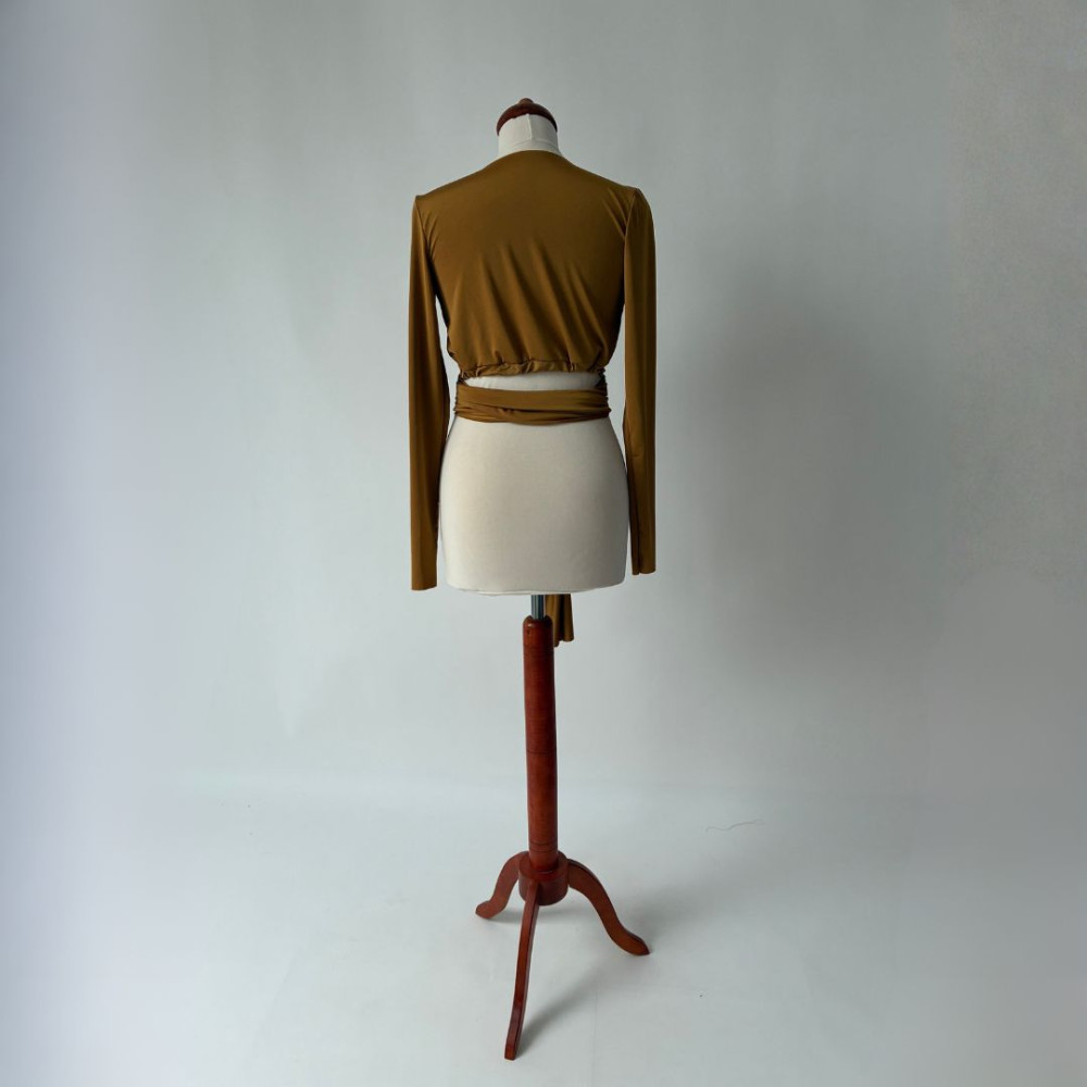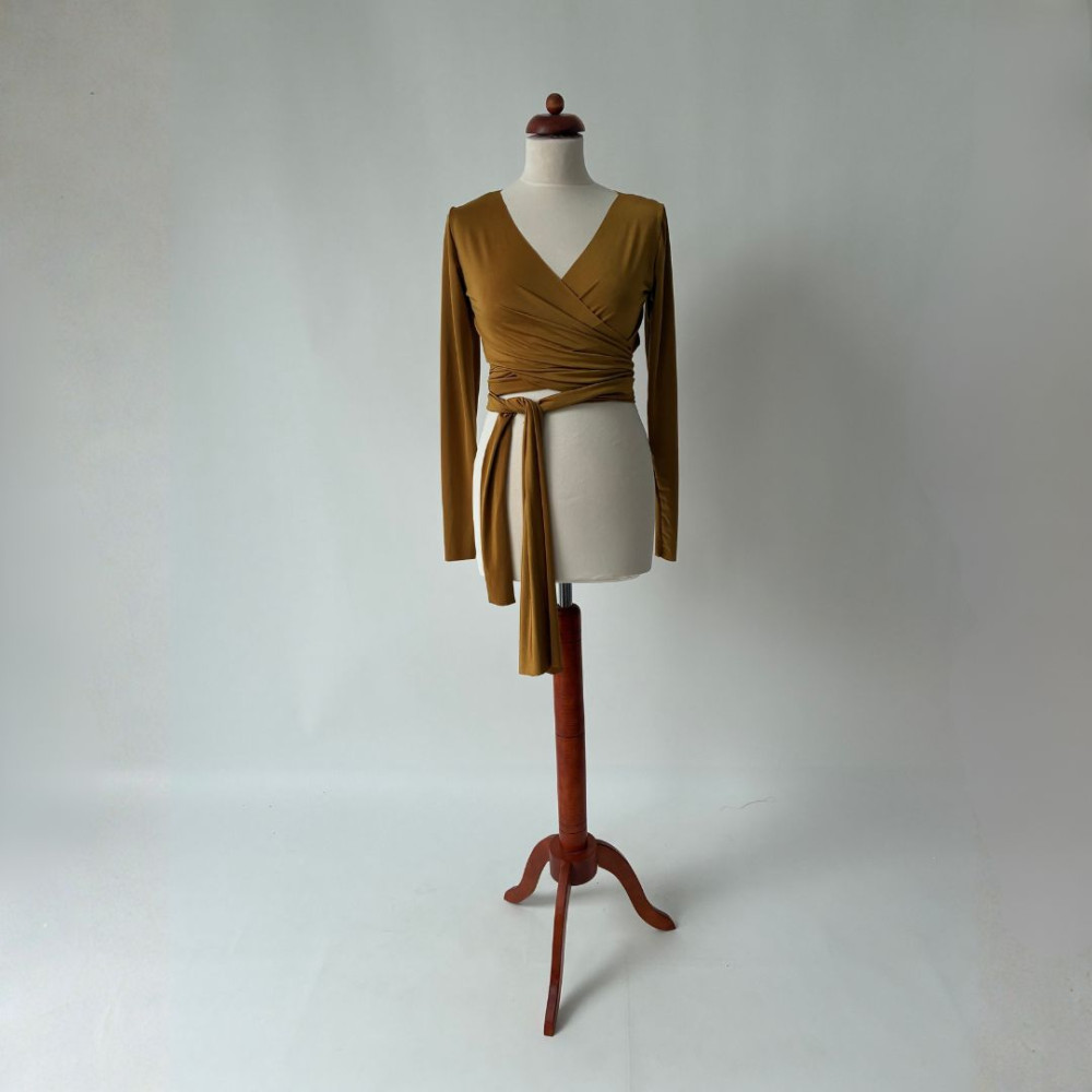 Variabilní crop top Longevita s rukávy - to je halenka, která se nosí ke kalhotám nebo sukni s vysokým pasem. Dá se vázat na mnoho způsobů stejně jako šaty střihu Longevita. Nemá gumičku v pase (pouze v zadní části s lodičkovým výstřihem), pas stahuje specifický střih a látka úpletového materiálu.