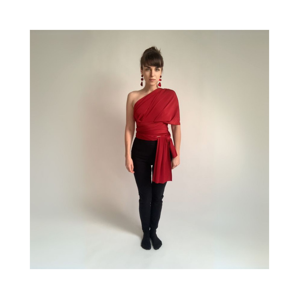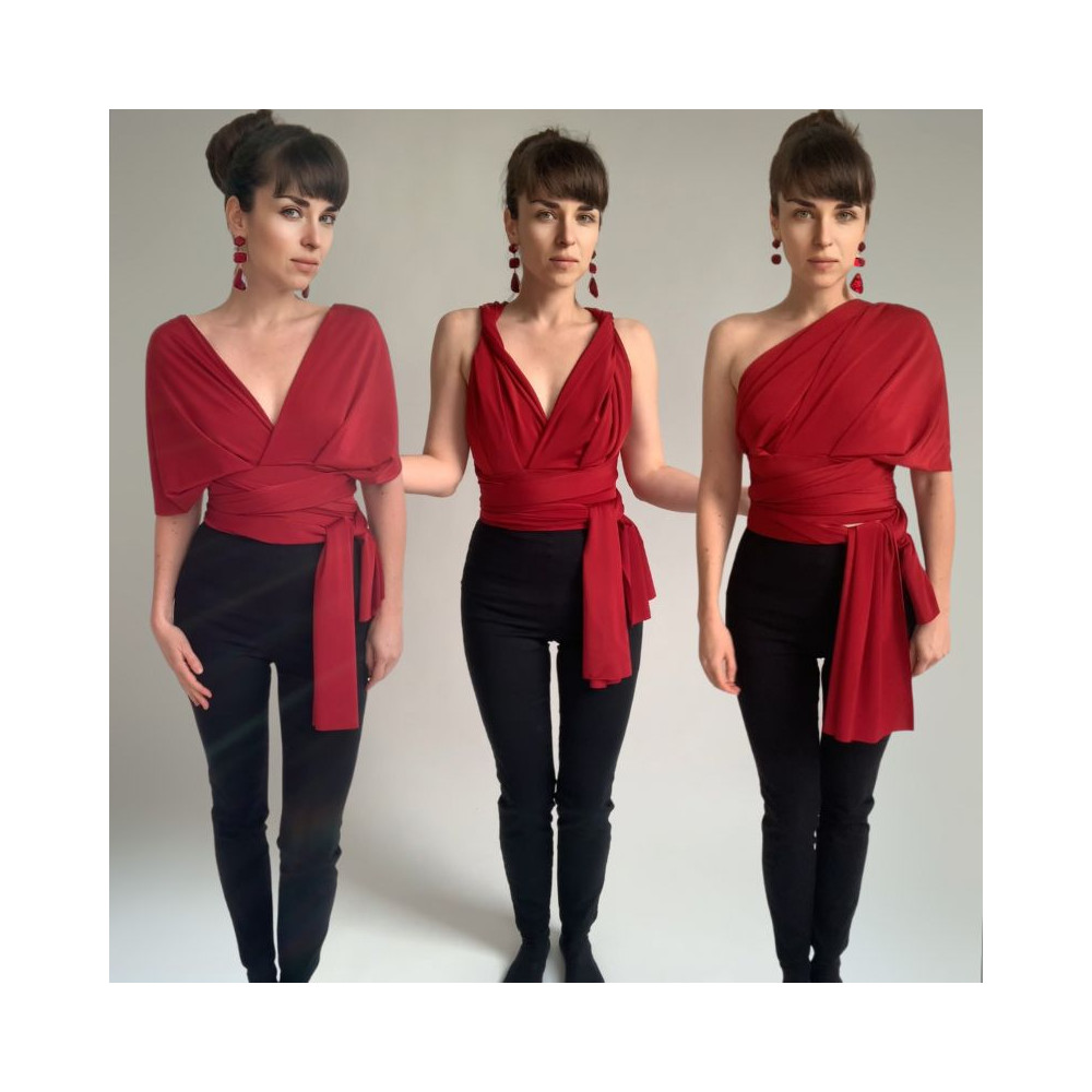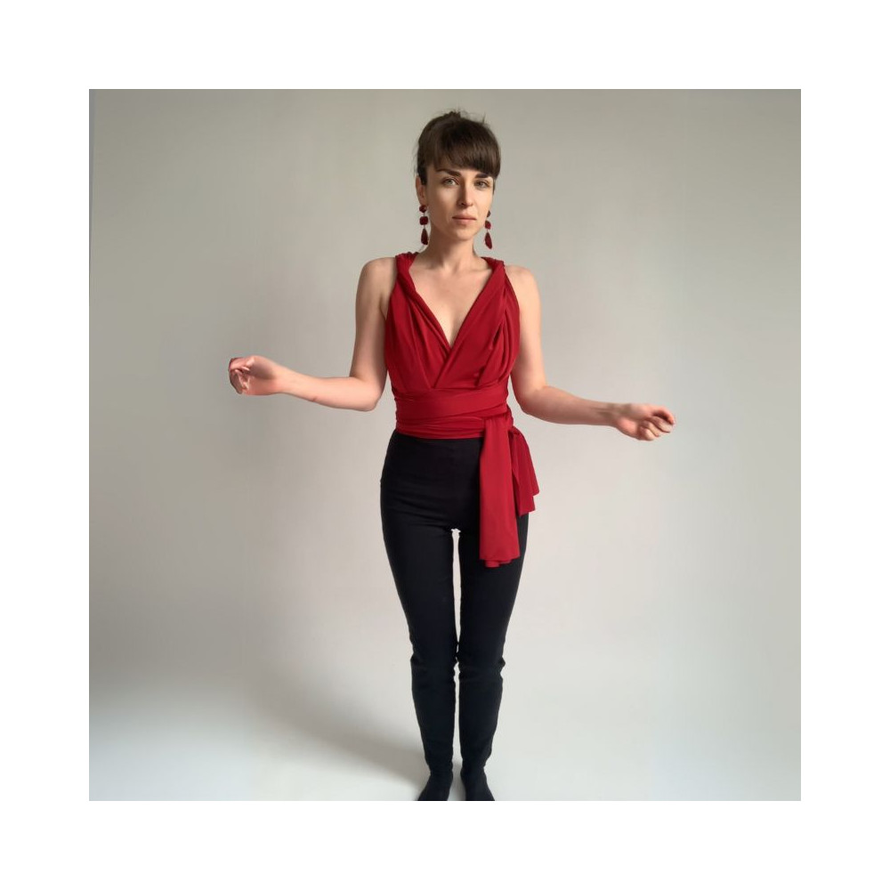 Variabilní crop top Bohème - halenka, která se nosí ke kalhotám nebo sukni s vysokým pasem. Dá se vázat na mnoho způsobů stejně jako šaty střihu Bohème. Nemá gumičku v pase, pas stahuje specifický střih a látka úpletového materiálu. Tento crop top má dvojitý střih vázacích pruhů a obsahuje odnímatelné vycpávky. Díky tomu není nutné samostatné bolerko a kryje dokonale poprsí i bez něj.