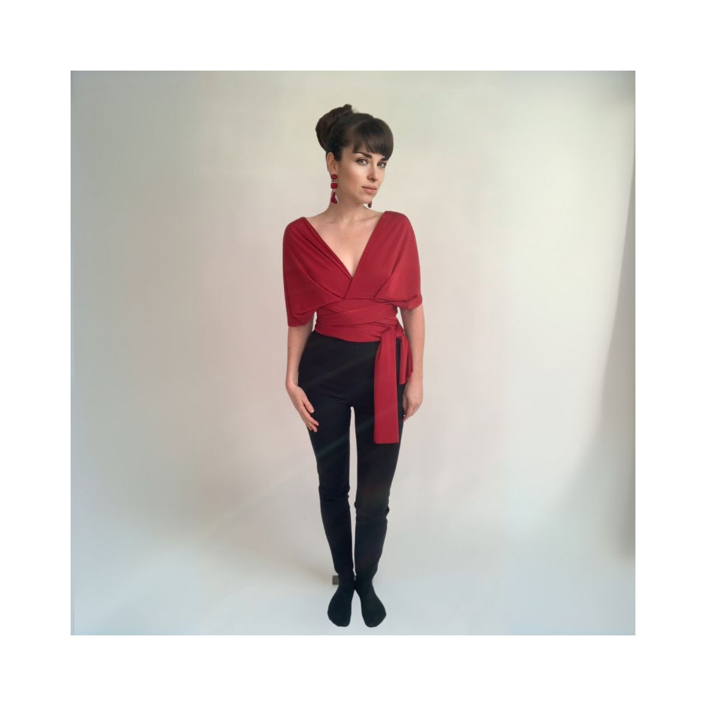 Variabilní crop top Bohème - halenka, která se nosí ke kalhotům nebo sukni s vysokým pasem. Dá se vázat na mnoho způsobů stejně jako šaty střihu Bohème, má však trochu jiný střh.