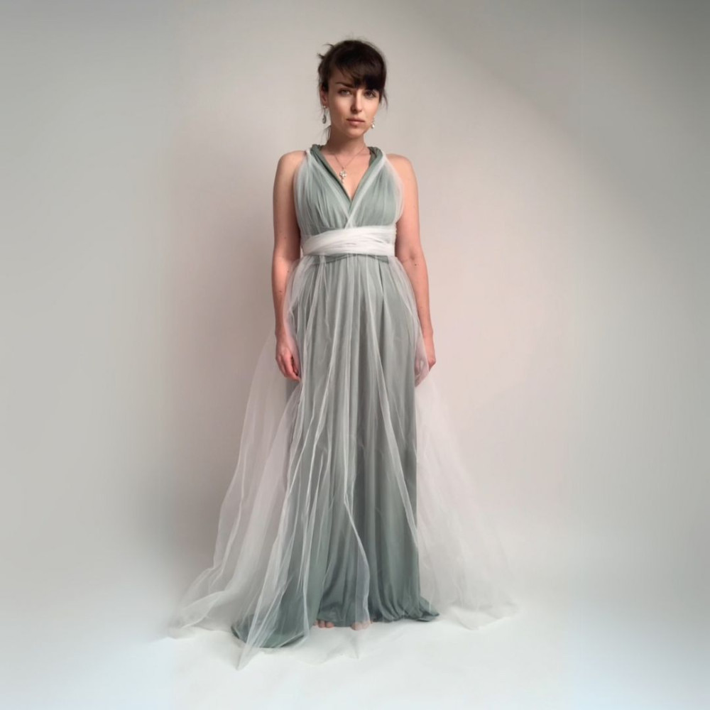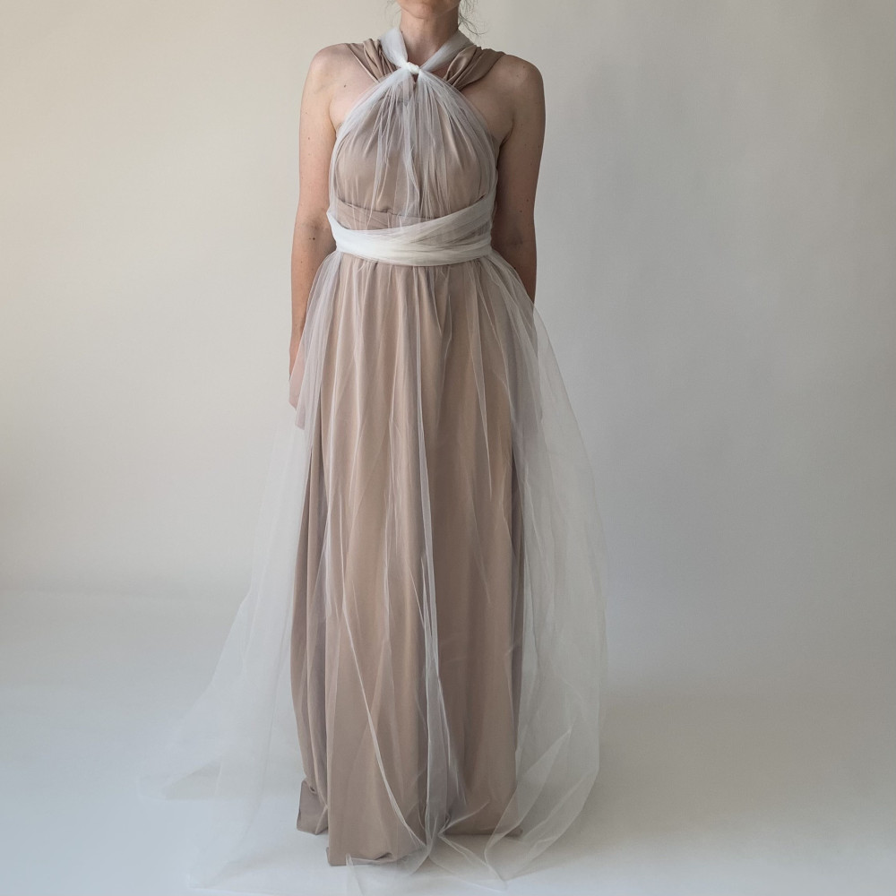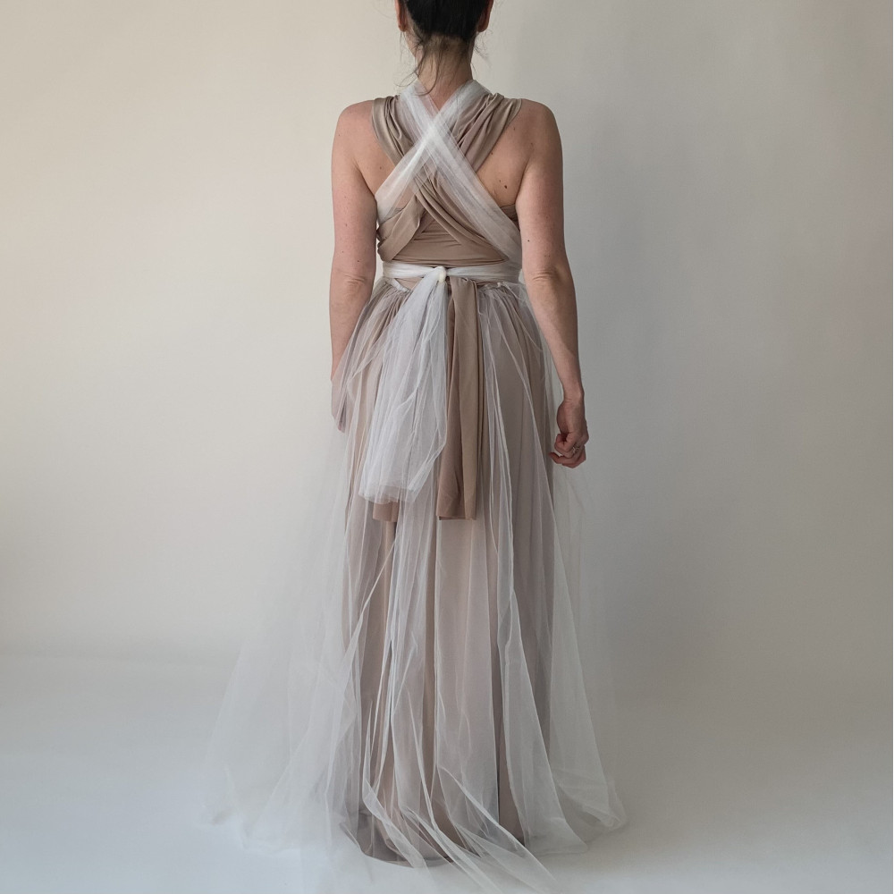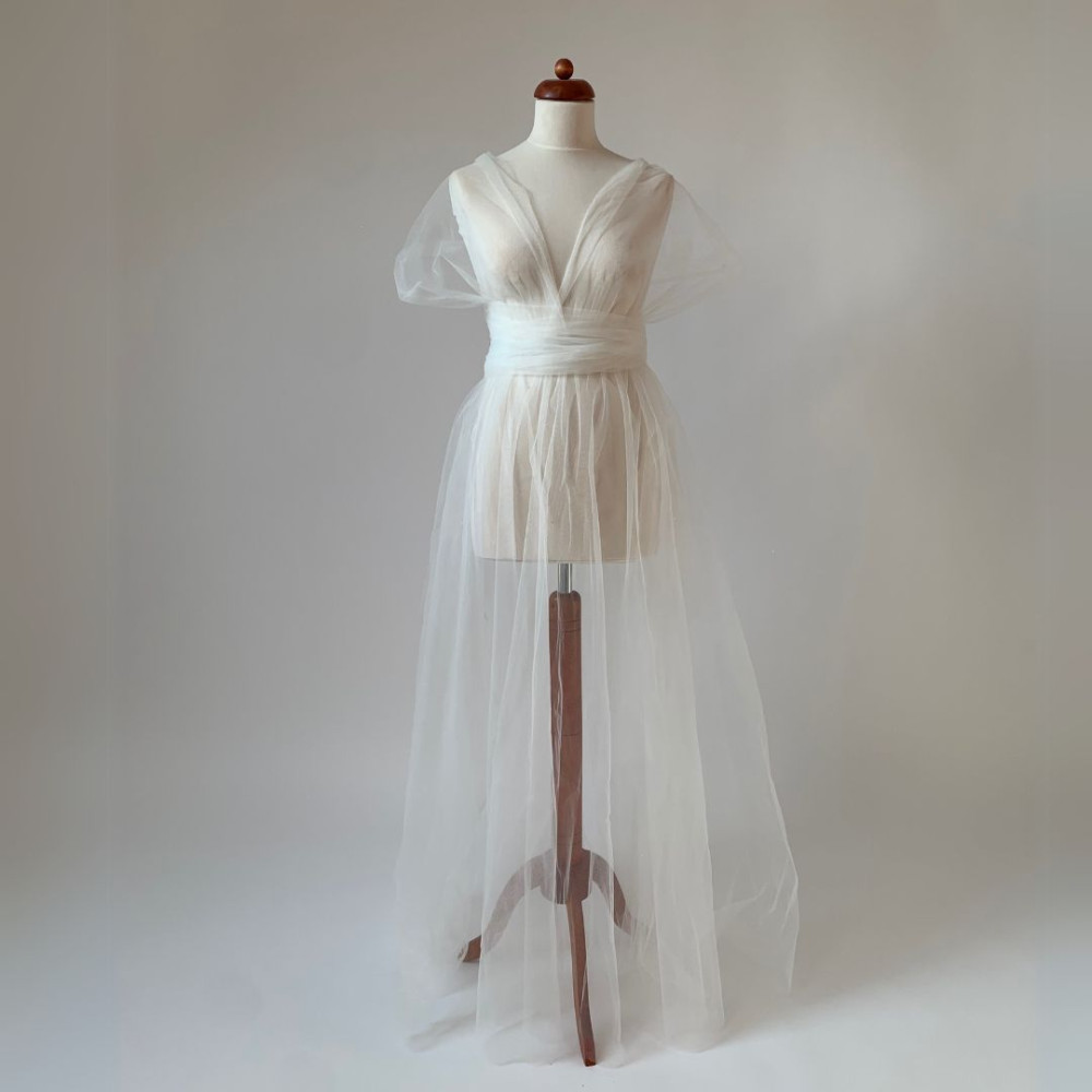 Dlouhé tylové krycí šaty jsou ideální doplňkem k šatům Convertibles®. Jsou vyrobeny z jedné vrstvy splývavého tylu - sukně a dva vázací pruhy.